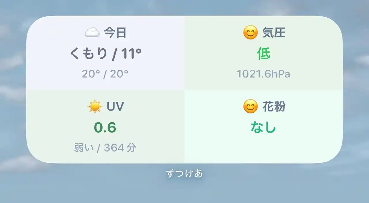 | 当社は、体調管理アプリ「ずつけあ」において、天気・花粉・紫外線(UV)・気圧情報を一画面で確認できる統合ウィジェット機能を新たに提供開始したことをお知らせいたします。 |