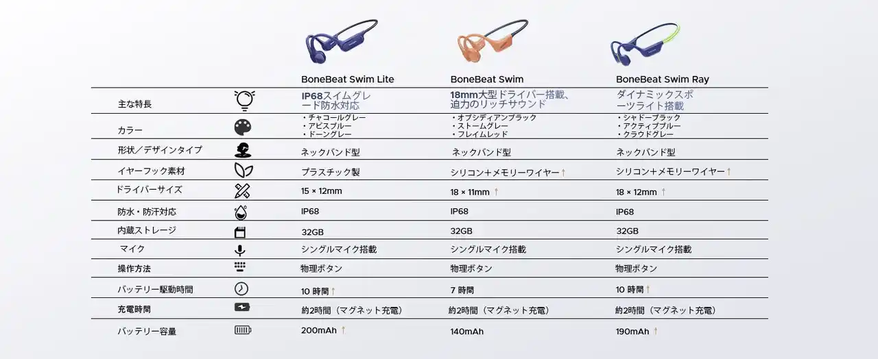 ランニング・夜間ウォーキングをする方 水泳やトライアスロンを楽しむ方 ジムやフィットネスユーザー 通勤・通学で安全に音楽を楽しみたい方 |