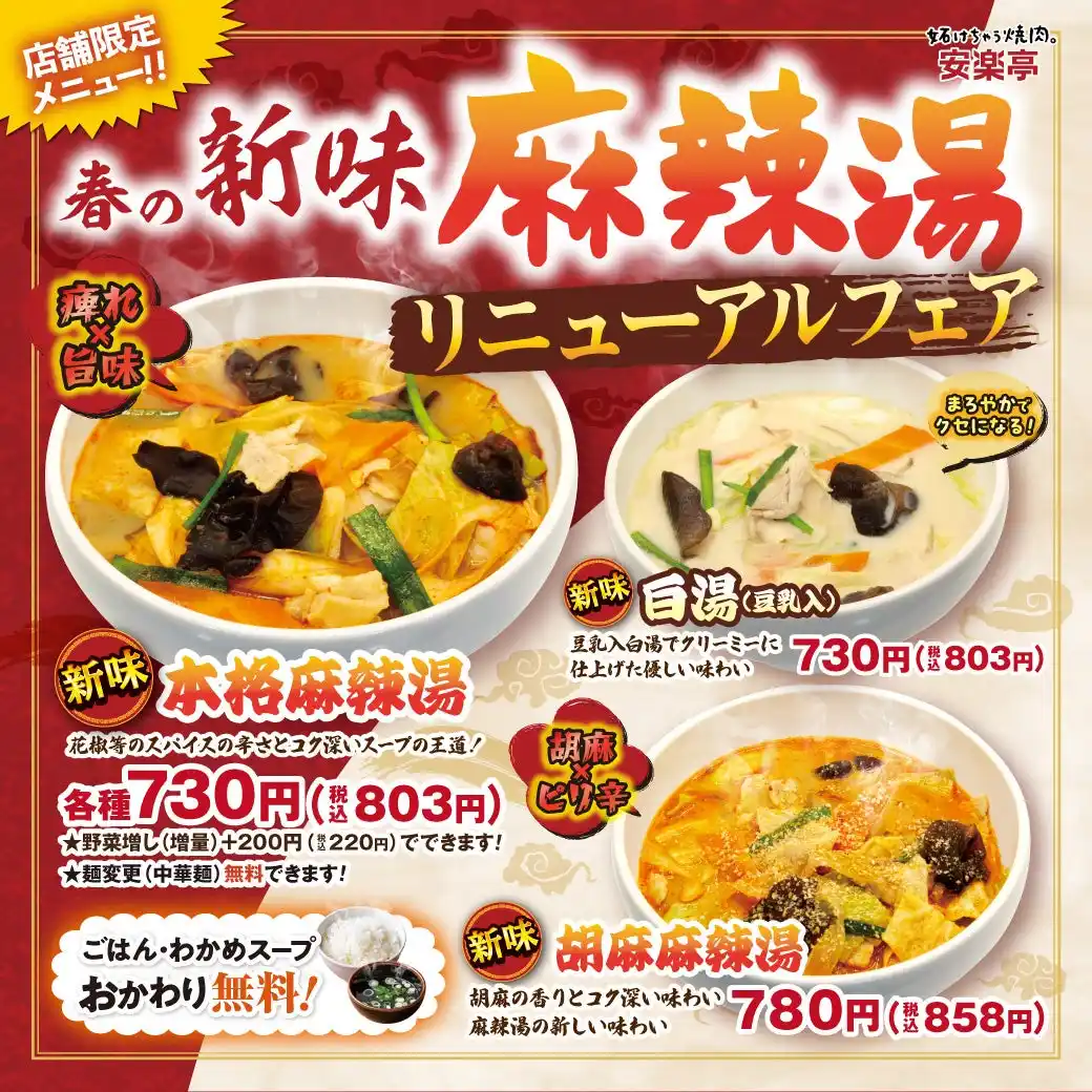 | 株式会社安楽亭(本社:埼玉県さいたま市)は、2026年4月23日((木))より、12店舗限定販売中の麻辣湯と白湯、胡麻(ゴマ)麻辣湯(全て太春雨入り)を販売開始いたしました。 |