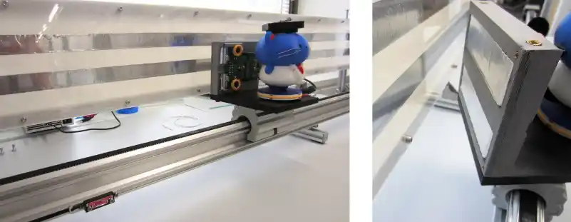 | レール上を走行するロボットを用いて、簡単に検証・評価を自動化できるシステムです。 | ||||