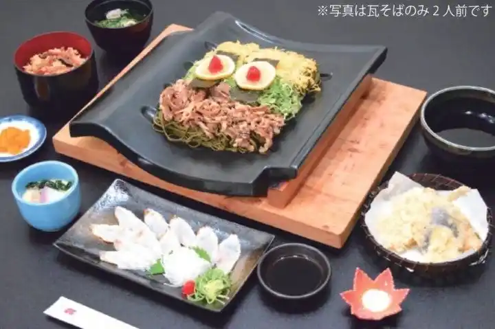 | アツアツの瓦の上に風味豊かな茶そばを乗せ、錦糸卵や甘辛く煮た牛肉などの具材を盛りつけた、山口を代表するソウルフード | ||||||||||