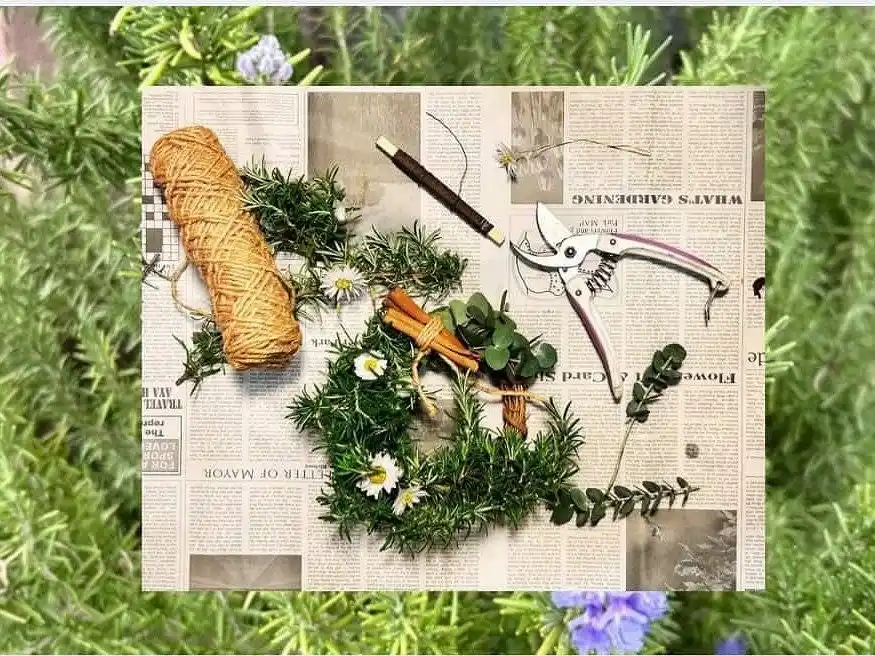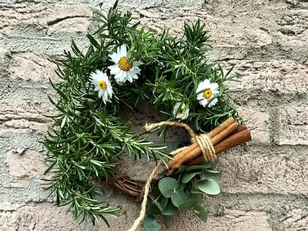 ローズマリー・ユーカリ・シナモンを使った 小さなハーブリースを作成 ・完成したハーブリース ・ローズマリー苗付き(すぐ使える「活用ガイド」)をお持ち帰り |