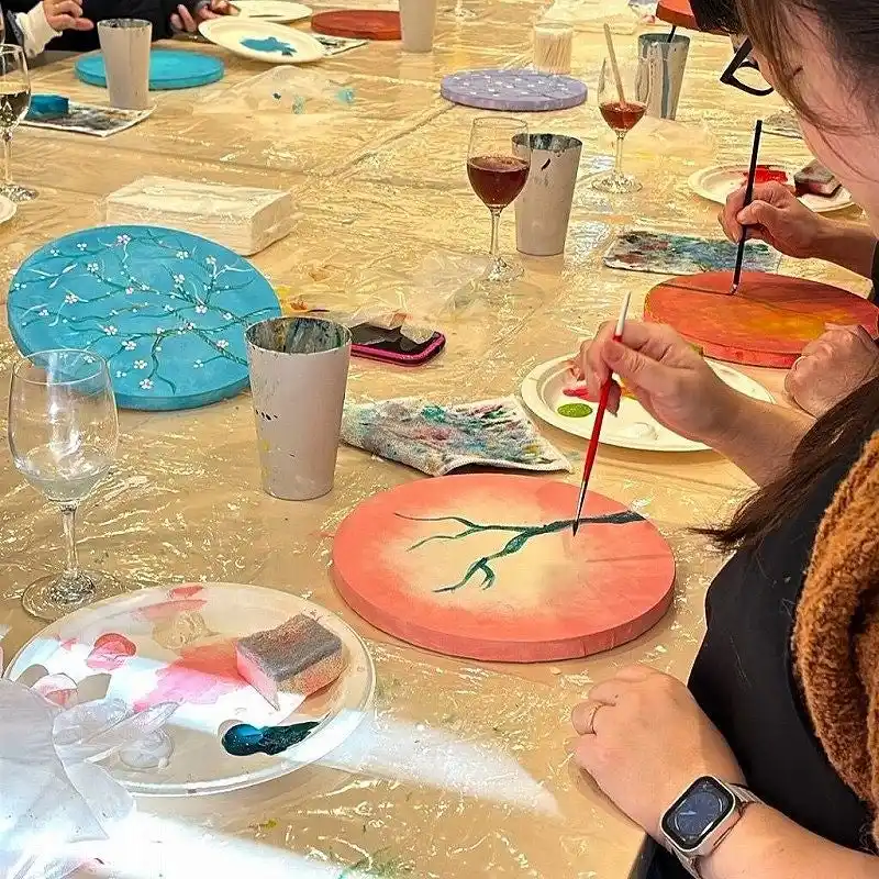 サンクゼールのワインやシードル(またはソフトドリンク)を楽しみながら行うアート体験 ・第一部:完成した作品をお持ち帰り ・第二部:完成したオリジナルラベルのシードル(ハーフサイズ)をお持ち帰り |