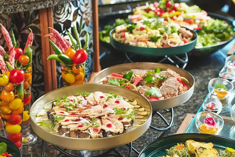 フレンチビュッフェのおすすめは、地元野菜を使った色とりどりの繊細な前菜の数々、鉄板コーナーでシェフが仕上げる魚料理や肉料理。 |