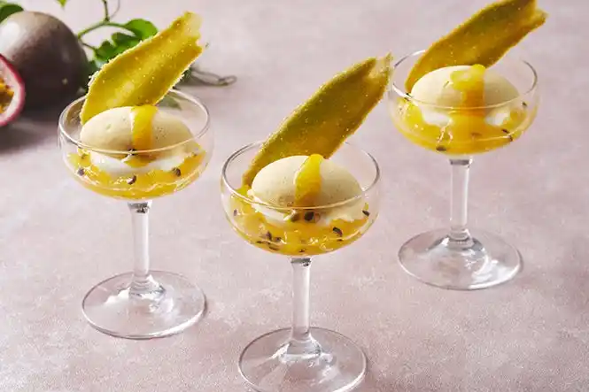杏仁豆腐と濃厚なバニラアイスクリームに、パッションフルーツソースの爽やかな酸味を添えて目の前で仕上げます。 |
