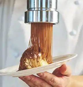 季節のフルーツで作ったアイスクリームに、パティシエがモンブランマシンでクリームを絞って仕上げるスペシャルスイーツ。爽やかなパッションフルーツアイスと濃厚なチョコレートクリーム、口の中で二つの味が溶け合います。 |