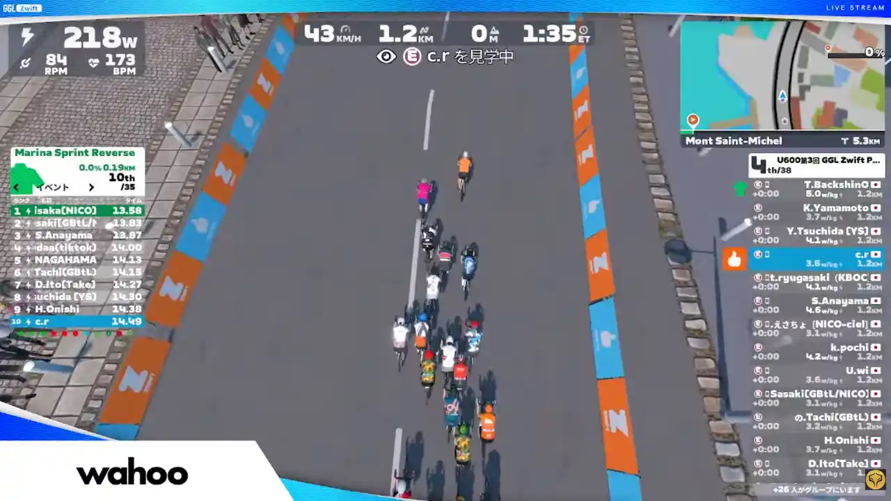20時、最初のレースとなる「U600の部」がスタートしました。 本部門は、直近のZwift内でのレースデータ等に基づく「レーススコア」が600以下(※1)のプレイヤーを対象としたものです。 しかし、単なる「カジュアル部門」という位置づけとは裏腹に、エントリー総数36名のリストにはスコア上限ギリギリの猛者も名を連ね、熾烈な戦いが予想されました。 |