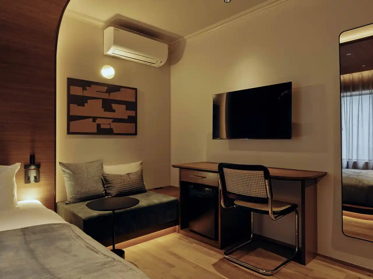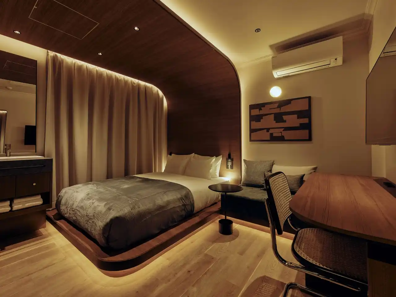 | お部屋で待っているのは、包み込まれるようなアールの天井と、一般的な電球色よりも温かな「2400K」の光。柔らかな灯りのなかで、明日へ向けて心地よく心身をリセットするひとときをお楽しみください。 | |||||||||||||||||