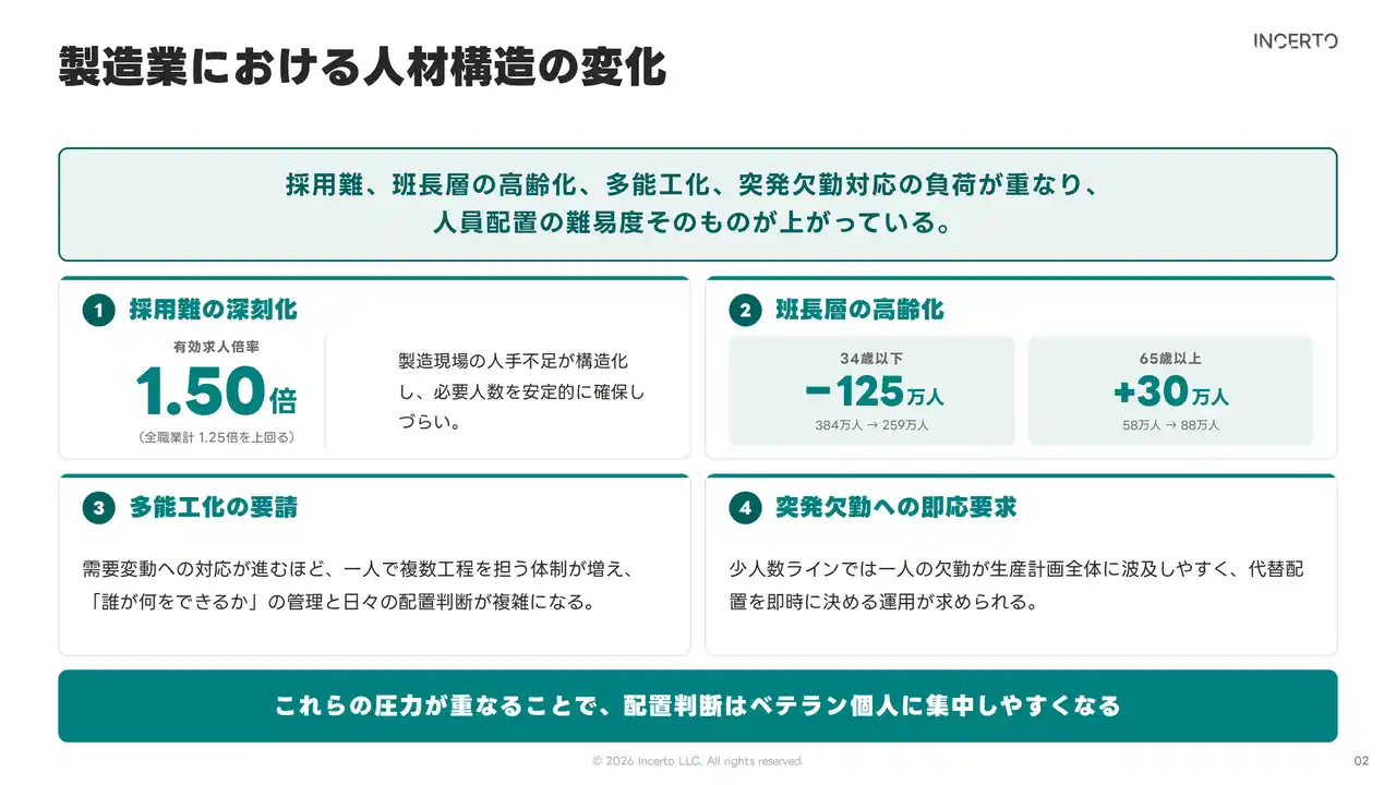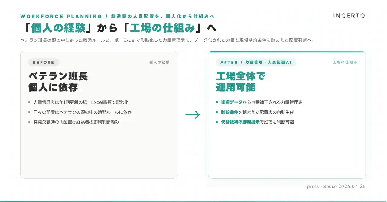 Incerto合同会社(本社: 東京都荒川区、代表: 佐藤碧人、https://www.incerto.tech/)は本日、製造業特化の 『力量管理・人員配置AI』 の提供を開始しました。 |