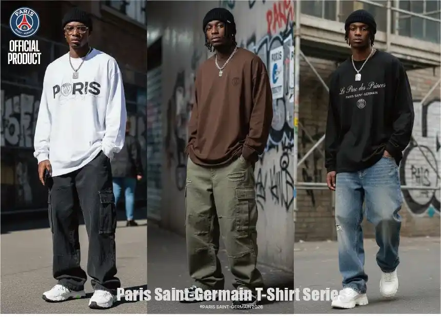 | 本コレクションは、PSGの洗練されたエンブレムやタイポグラフィを、現代的なオーバーサイズシルエットに落とし込んだ一着。絶妙なリラックス感と、都会的なエッセンスが融合したストリート仕様に仕上げました。 | |||