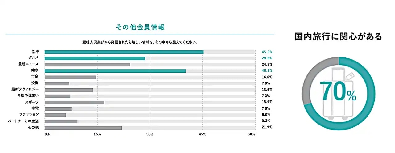 今回しまむらが商品開発のパートナーとして趣味人倶楽部を選んだ背景には、会員属性の親和性があります。調査によると、会員の約7割が国内旅行に関心を持ち、情報ニーズにおいても「旅行」が「健康(40.2%)」や「グルメ(28.6%)」を抑えて最多の45.2%に達しています。この「旅に対して能動的なシニア層」から直接380名もの声を集約することで、一般的な市場調査では辿り着けない、旅先での細かな悩みや理想を反映した共創型の商品開発が実現しました。 |