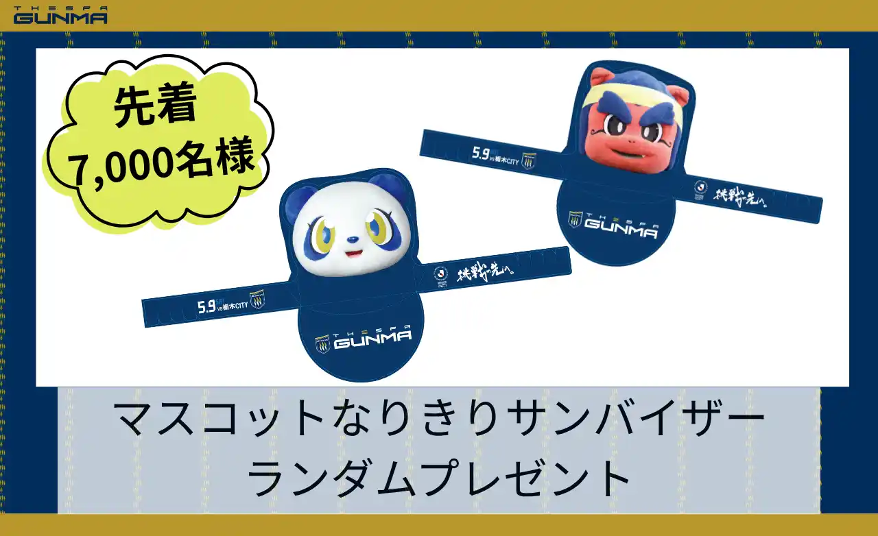<来場者プレゼント> 先着7,000名様に、『マスコットなりきりサンバイザー』をプレゼントいたします! クラブマスコットの「湯友」「ザスパンダ」の2種類を、各ゲート(3ゲートを除く)にてランダムに配布いたします。 |