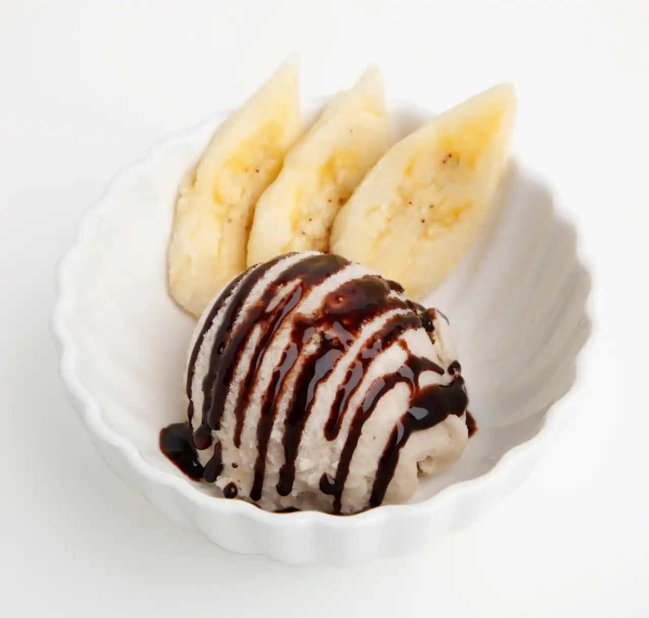 甘熟王バナナを練り込んだバニラアイスに、チョコレートソースをトッピングしました。添えたスライスバナナと一緒に召し上がっていただくと、甘熟王バナナの甘みをよりしっかりと感じていただけます。 |