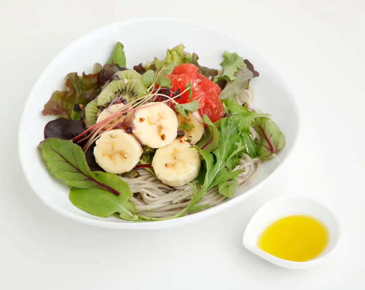 甘熟王バナナ、キウイ、ピンクグレープフルーツを添えたフルーツサラダを、お蕎麦と一緒に盛り |