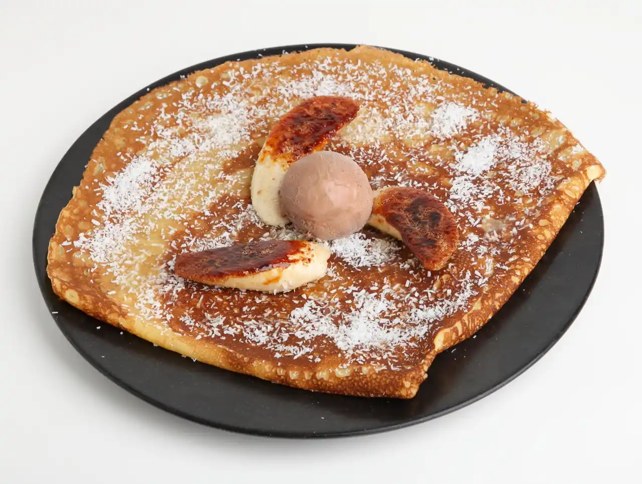 コクのある甘さと食感が特徴の甘熟王バナナを香ばしくキャラメリゼしました。ココナッツパッションフルーツのソースとローストしたココナッツファイン、チョコレートアイスを合わせたクレープです。バナナの甘さを活かした、このフェアだけの特別な一皿をお楽しみください。 |