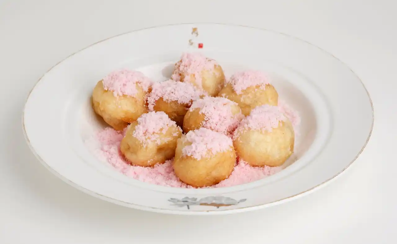揚げました。ピンクに色付けした砂糖をまぶした、見た目も楽しいデザートです。 |