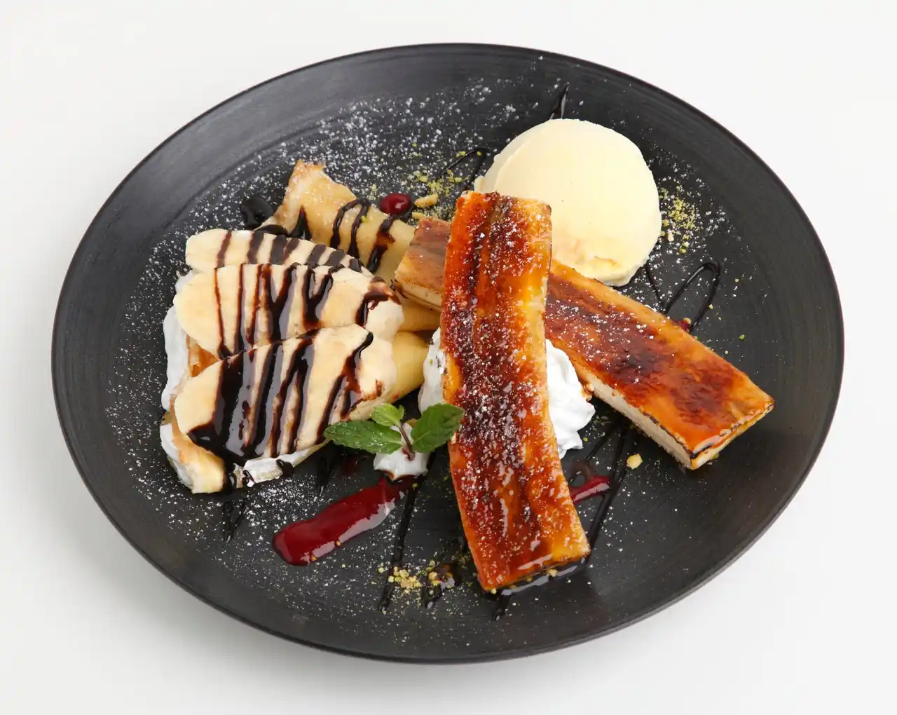香ばしくキャラメリゼした甘熟王バナナと手作りクレープに、バニラアイスを添えました。スライスバナナやチョコソースと共に召し上がってください。甘酸っぱいフランボワーズソースとピスタチオパウダーがアクセントになった香りも楽しめる一皿です。 |