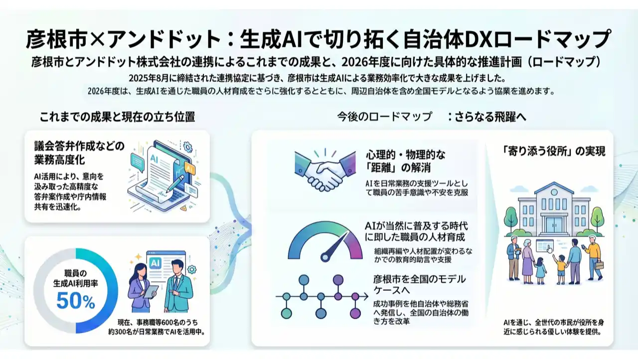 アンドドットは、総務省自治大学校との連携実績をはじめ、全国150自治体以上への生成AI活用支援を通じて培ったノウハウを活かし、彦根市のさらなるDX推進を支援してまいります。また、本取り組みの成果を全国へ発信し、地方自治体のAI活用のロールモデルとなることを目指します。 |