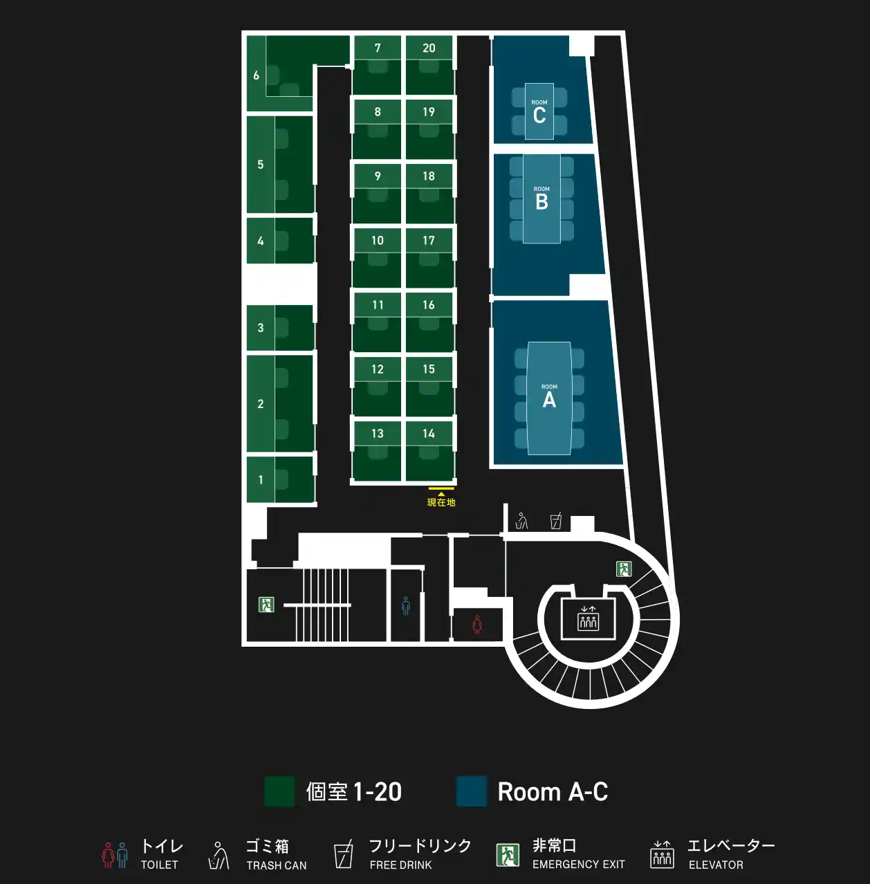 | 1名用の完全個室を17室、2名用の完全個室を3室ご用意しました。周囲の視線や会話を気にせず、自分だけの空間で仕事や勉強に没頭できます。 | |||
