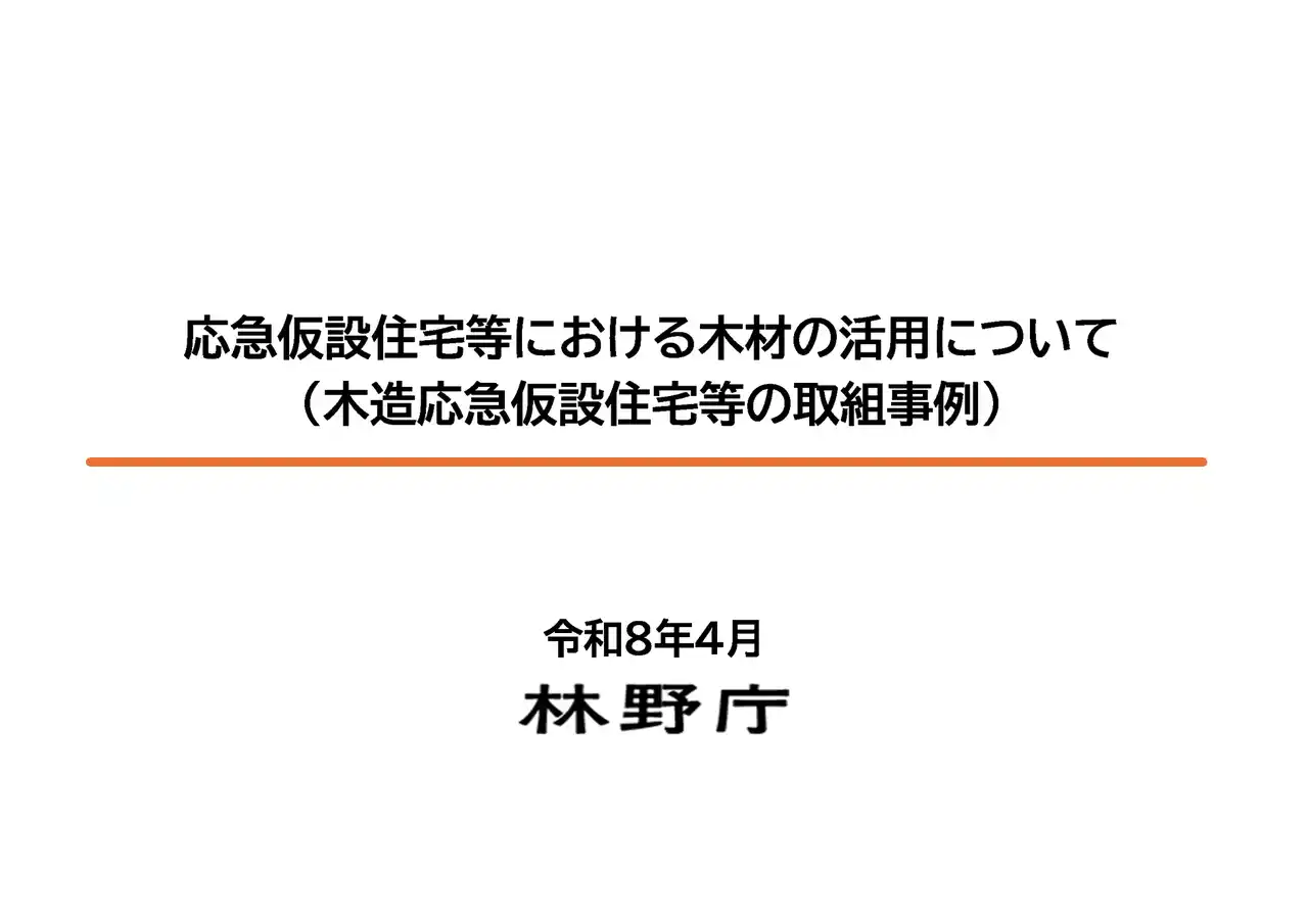 一般社団法人日本オフサイト建築協会(所在地:東京都千代田区、代表理事:長坂俊成)は、この度、林野庁が令和8年4月に全国の自治体向けに作成した『応急仮設住宅等における木材の活用について(取組事例)』において、木造応急仮設住宅の供給に係る主な団体の一つとして紹介されたことをお知らせいたします。 |