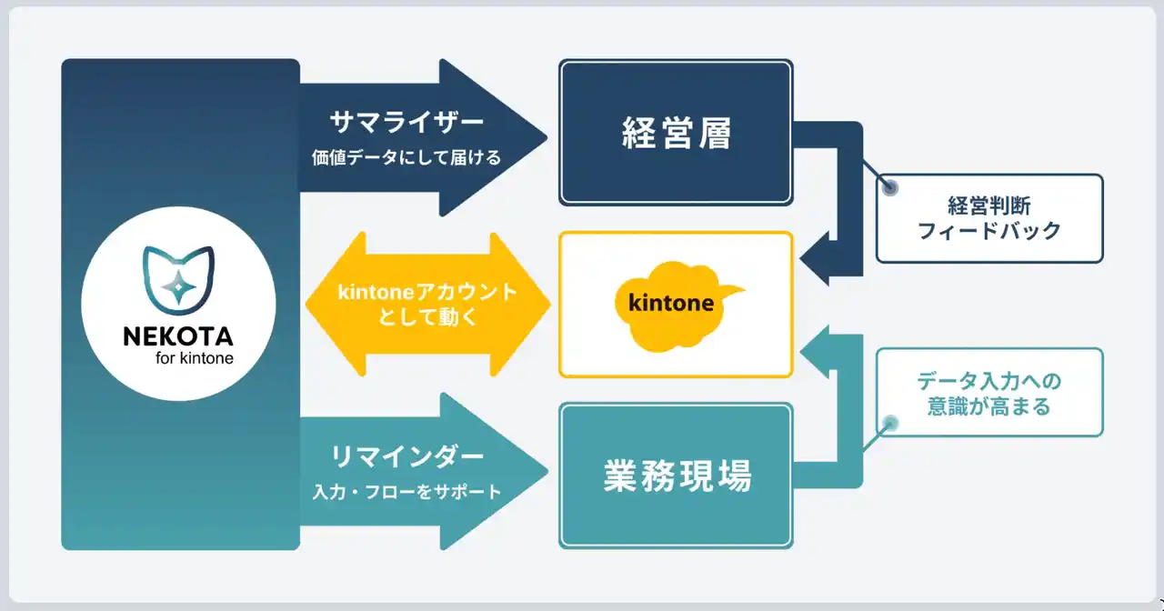 kintoneを「入力するツール」から「データが育つプラットフォーム」へ。NEKOTAは、このループを回し続ける仕組みです。 |