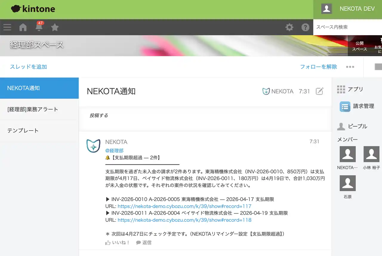kintoneアプリの一覧条件に合うレコードを検知し、対象者へスペーススレッドで@メンション投稿します。通知にはレコードの状況と次に取るべきアクションが含まれるため、受け取った人はそのまま行動に移せます。承認待ち、未対応、期限超過--kintoneに入力されたデータの中から「止まっている仕事」を見つけ出し、必要な人に届けて業務を前に進めます。 |