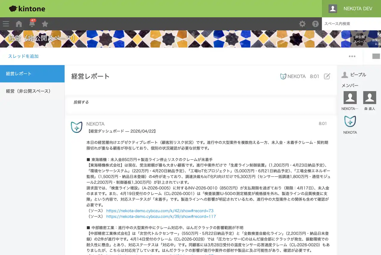 NEKOTA for kintone は、kintone上のユーザーとして動作するAIサービスです。kintoneアカウントを1つ追加するだけで導入でき、蓄積データを「行動を促すリマインド」と「意思決定に使えるサマリー」に変換して届けます。 |