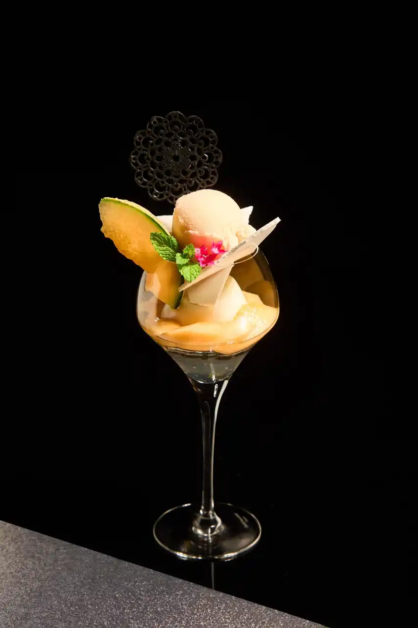 その記念すべき第一弾を手がけたのは、パティシエ・ソムリエの吉田真子氏。完熟メロンの瑞々しさ、テキーラゼリーの芳醇な余韻、燻製ナッツのスモーキーな深み。グラスの中に、メキシコの夜を閉じ込めました。テキーラやメスカルとのペアリングで、その表情はさらに豊かに広がっていく。 |