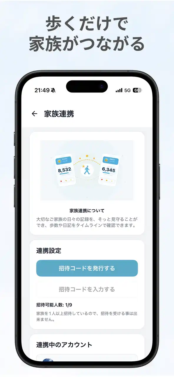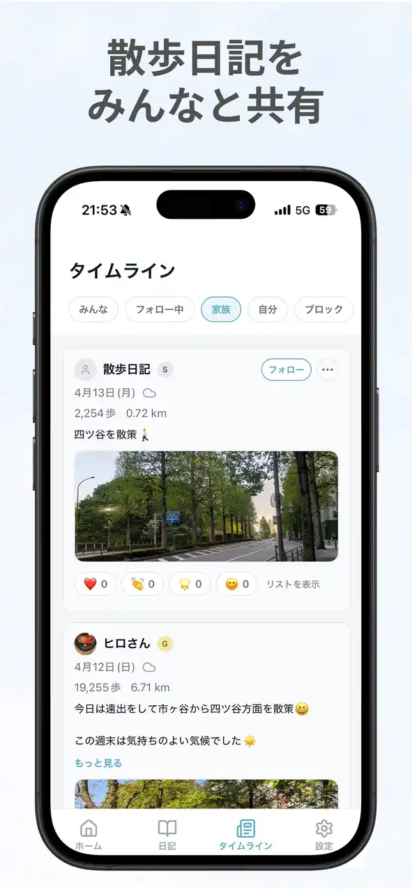 招待コードを使うだけで家族と繋がることができ、お互いの歩数や散歩記録をタイムラインで確認できます。コメント機能はなく、スタンプリアクション((ハート)️ 🌟 )のみを採用。 |