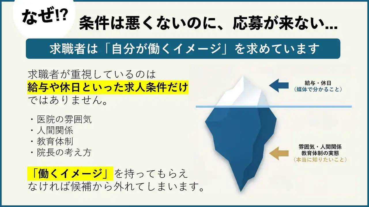 そうした求職者が職場選びで特に重視しているのは、医院の実際の雰囲気や人間関係、教育体制、そして院長の考え方などです 。 |