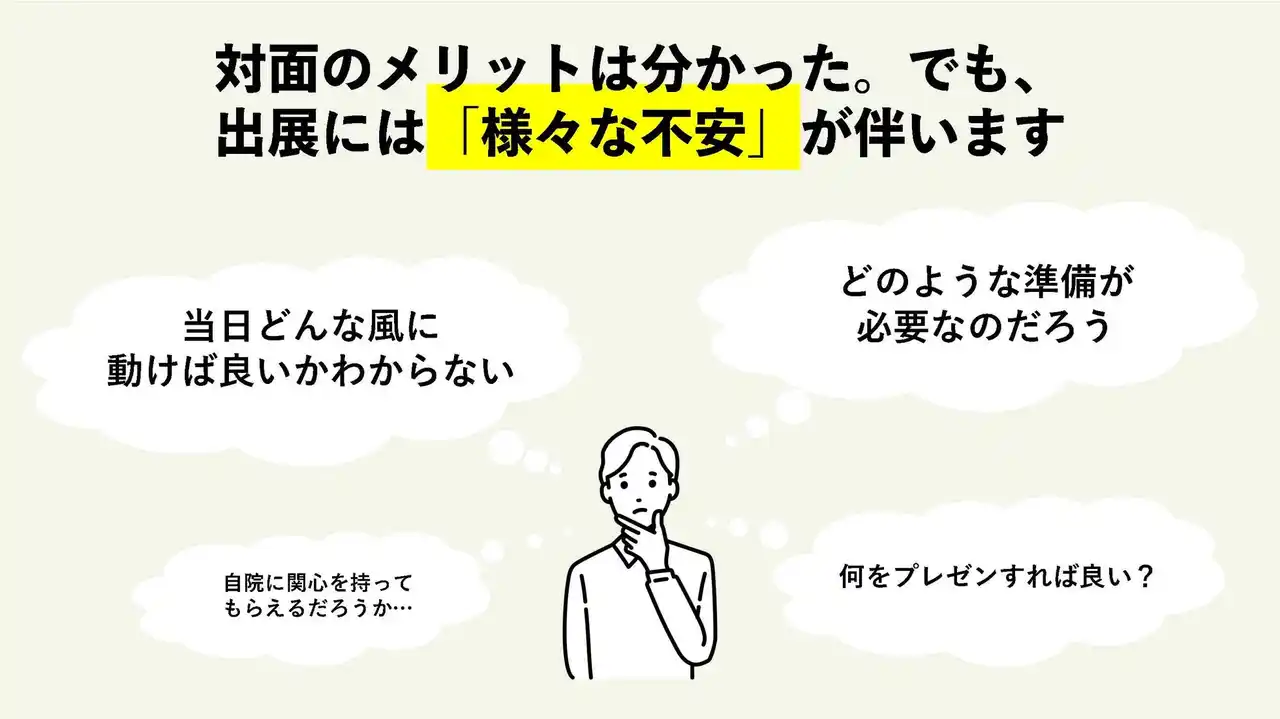 「そうは言っても、ブースで何を話せばいいかわからない」「準備に不安がある」という医院様の声に応え、クオキャリアでは専任担当者が事前準備から当日の運営まで一貫してサポートいたします。 |