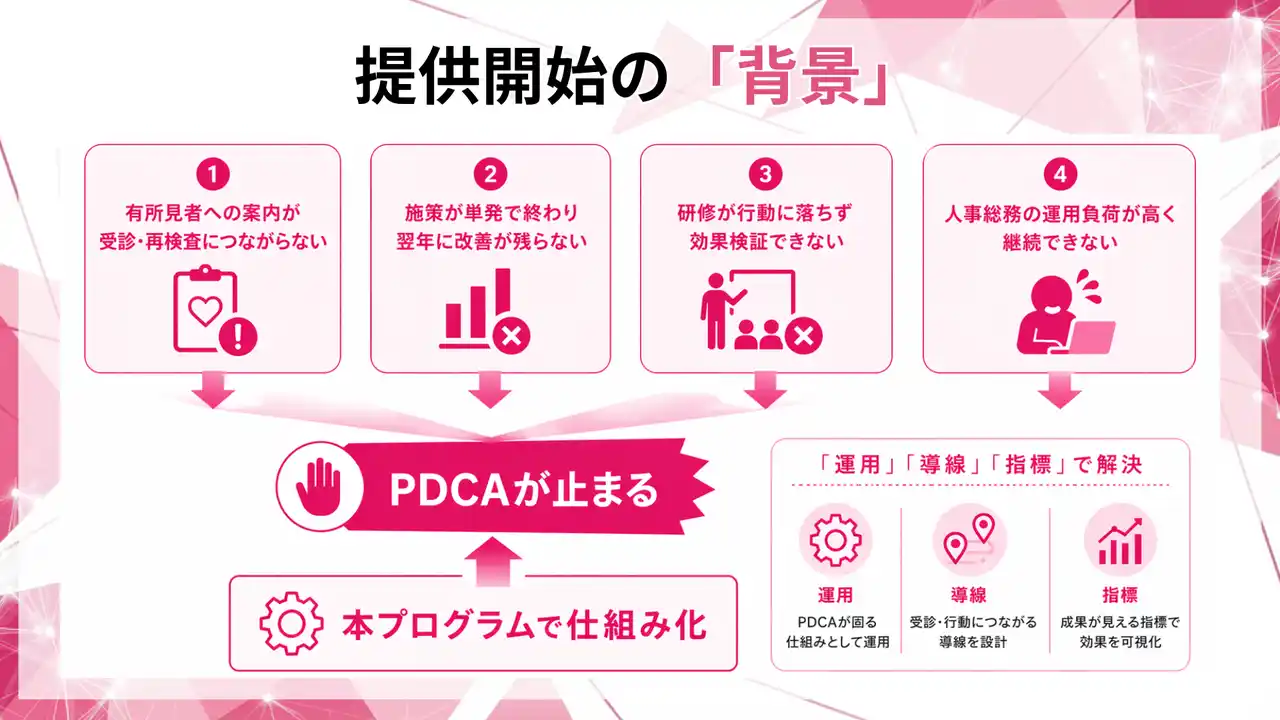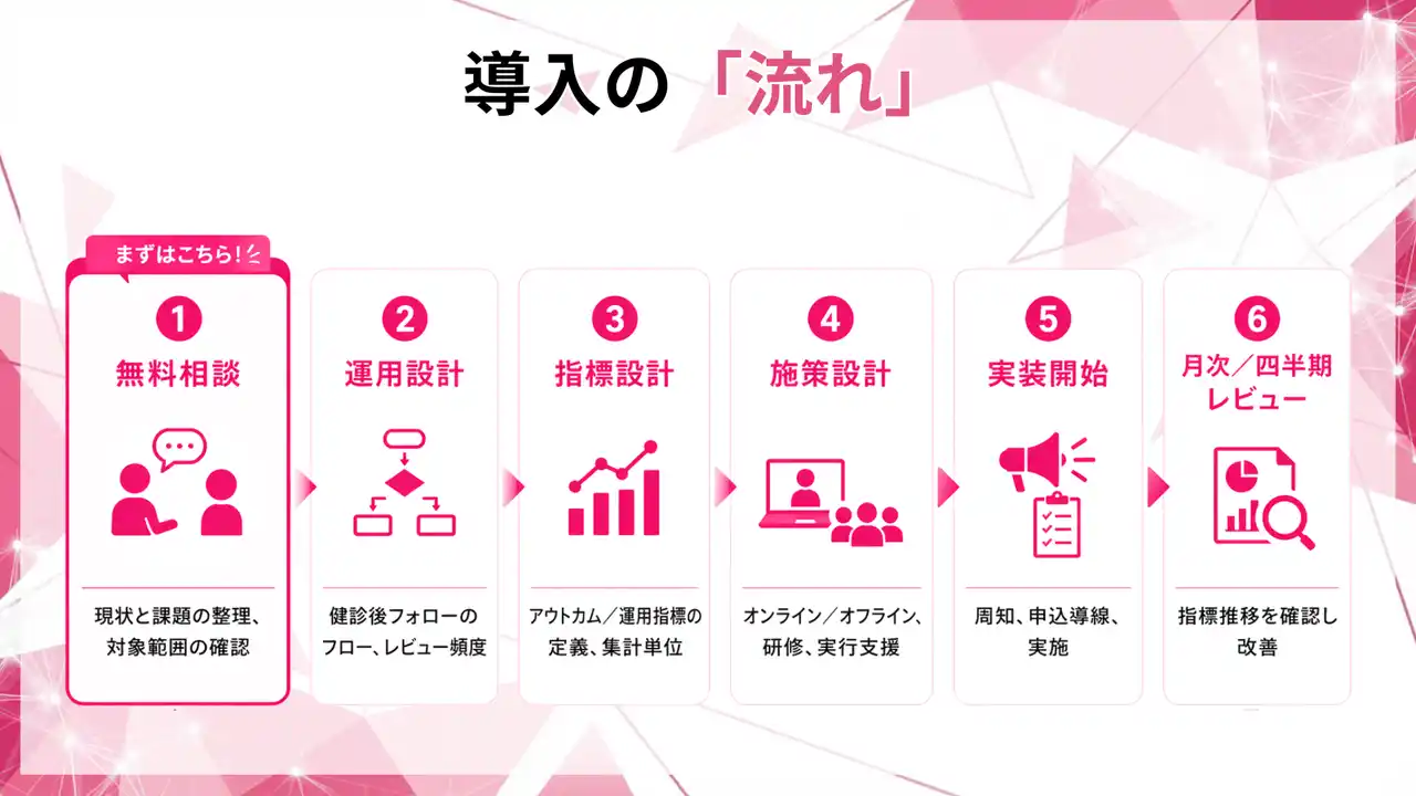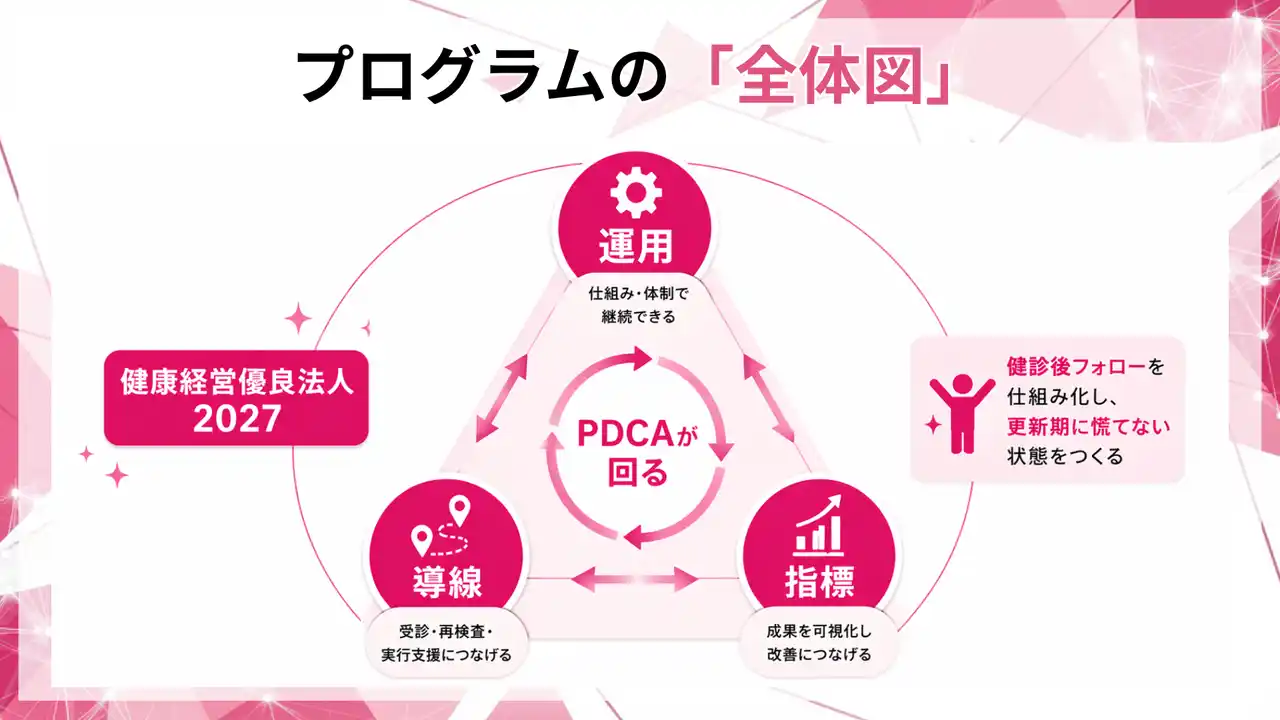 本プログラムは、健診後フォローを「運用」「導線」「指標」で仕組み化し、更新期に慌てない状態を作ることを目的に設計しました。 |