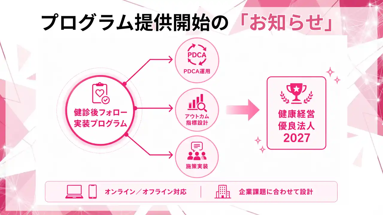 フラクタルワークアウト株式会社は、健康経営優良法人2027に向けて「健診後フォローをどう実装するか」をテーマに、PDCA運用とアウトカム指標の設計、施策実装までを一体で支援するプログラムの提供を開始します。 |