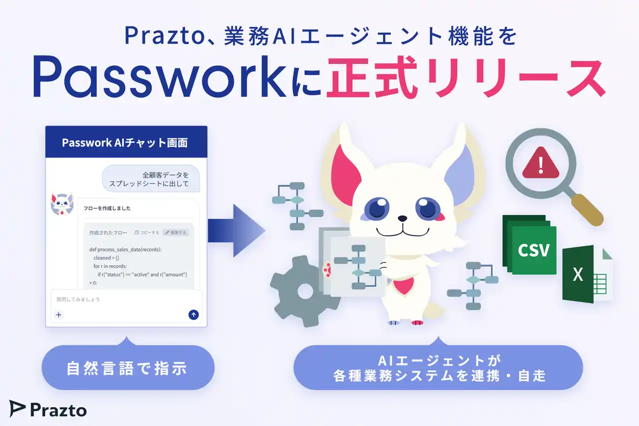 Praztoは、ノーコードで複数システム間のデータ連携を構築できる「Passwork」を基盤として、AIエージェントが業務を自走で代行する世界を、日本企業がすぐに使えるかたちで提供します。 |