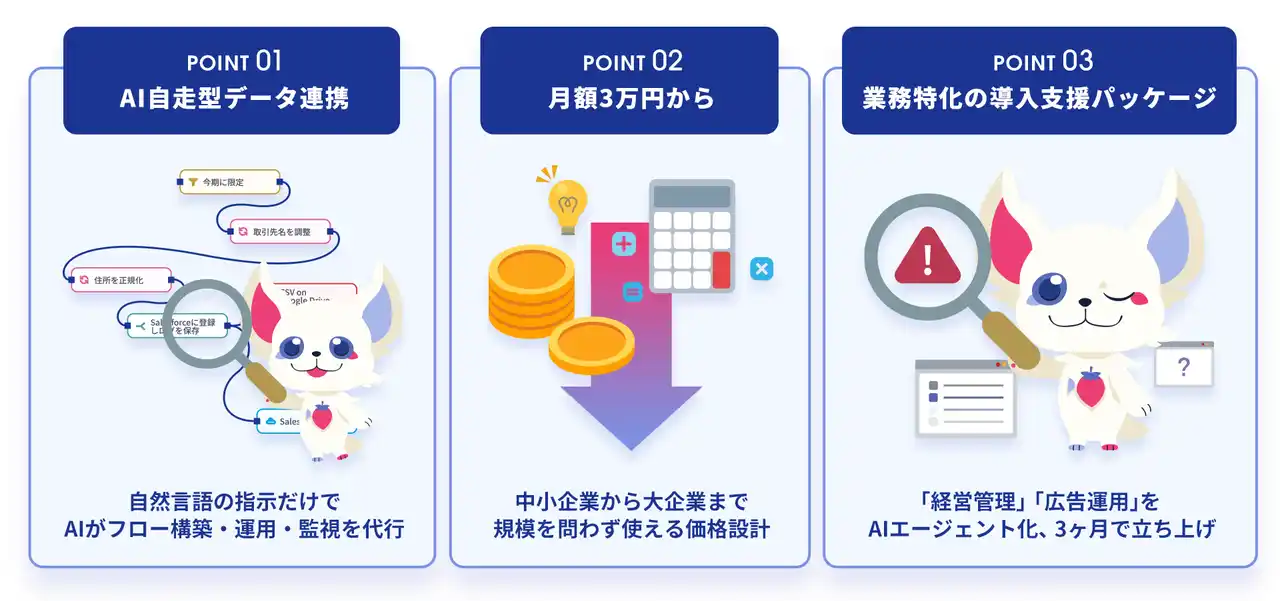 Point1 : AI自走型データ連携 ── 自然言語の指示だけで、AIがフロー構築・運用・監視を代行 |