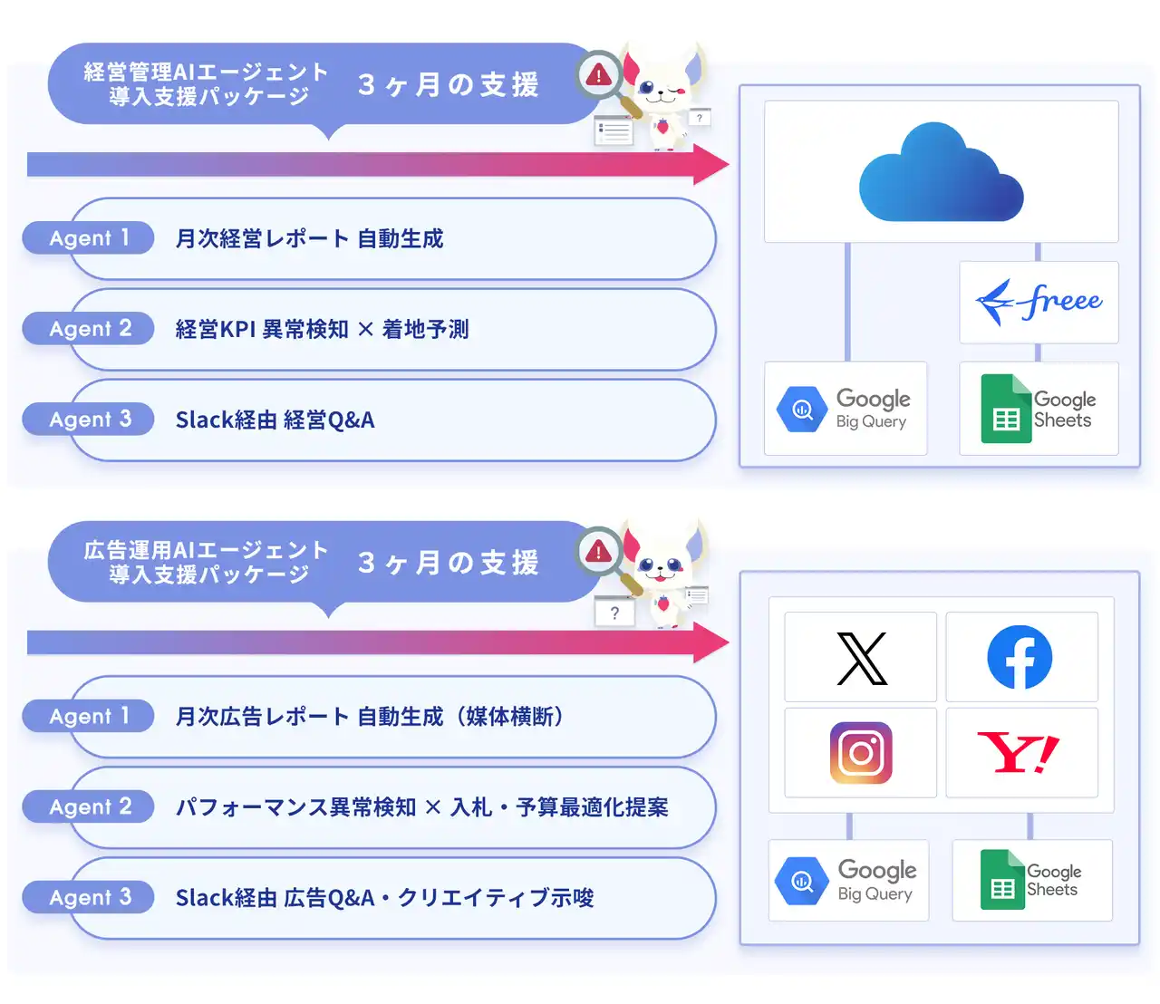 Point3 : 業務特化の導入支援パッケージ ── 「経営管理」「広告運用」をAIエージェント化、3ヶ月で立ち上げ |