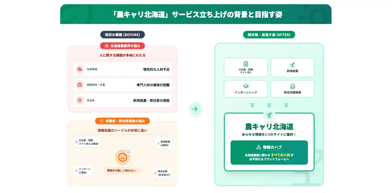 農キャリ北海道は、こうした求職者側の課題を解決し、あらゆる情報を一つのサイトに集約することで、北海道農業に関わるすべての人材が必ず訪れる情報のハブを目指して構築しています。 |