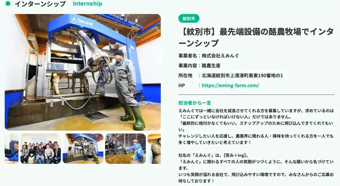 農キャリ北海道は、単なる求人広告の枠を超え、学び(インターン)からキャリア(就職)、そして暮らし(移住)までを一気通貫で結びつけるサービスです。専門家による手厚いサポートと最新のシステム連携、そして圧倒的なコストパフォーマンスで、皆様の採用・誘致活動を強力にバックアップいたします。 |