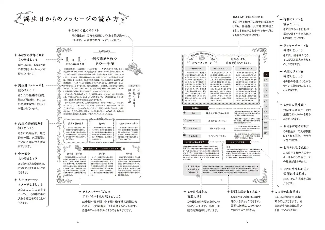 | たとえば、1月1日生まれの人には「責任感」「忍耐強さ」「揺るぎない信念」といった資質が語られ、人生を貫く強さと優しさが丁寧に描かれています。 | ||||||||||||||||
