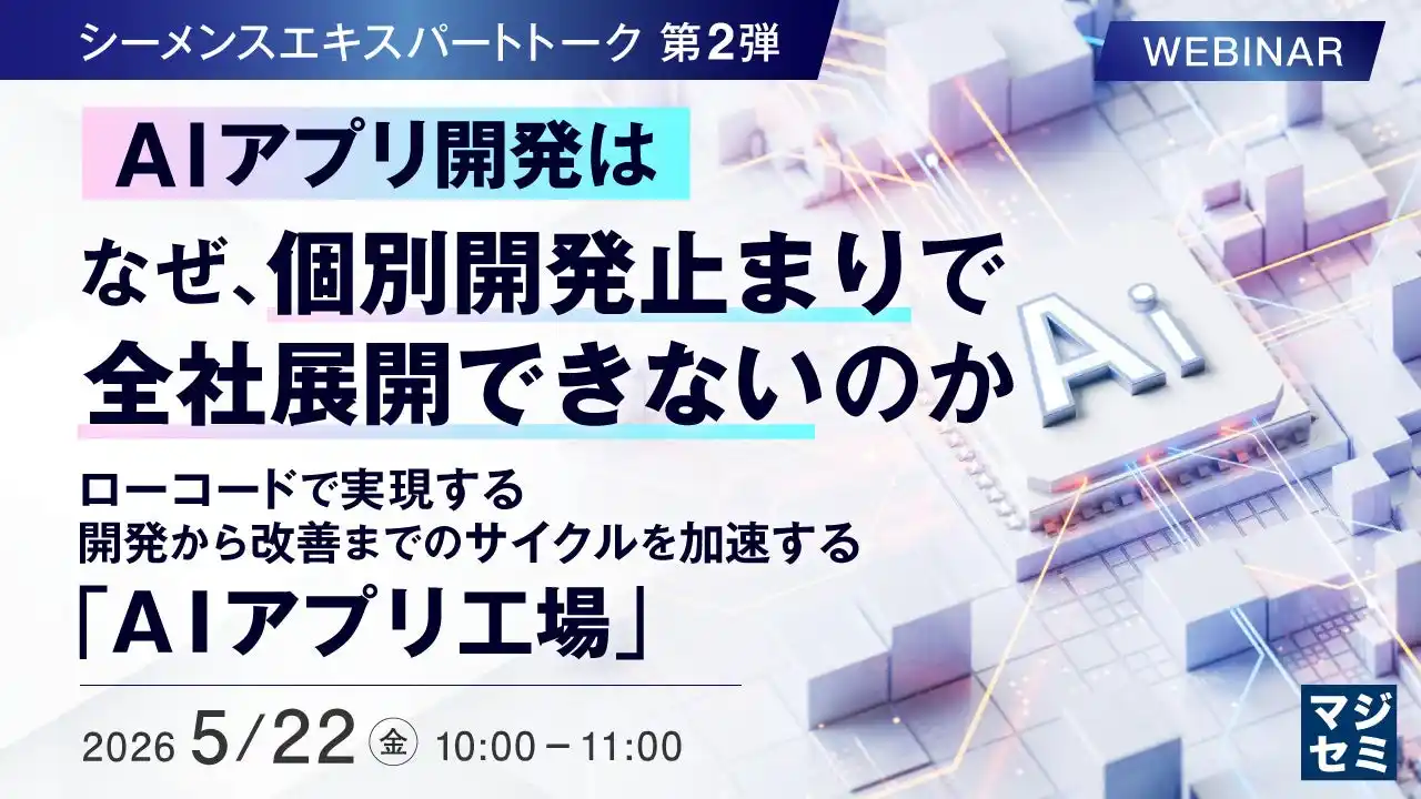 | マジセミ株式会社は「【シーメンスエキスパートトーク 第2弾】AIアプリ開発はなぜ、個別開発止まりで全社展開できないのか」というテーマのウェビナーを開催します。 |