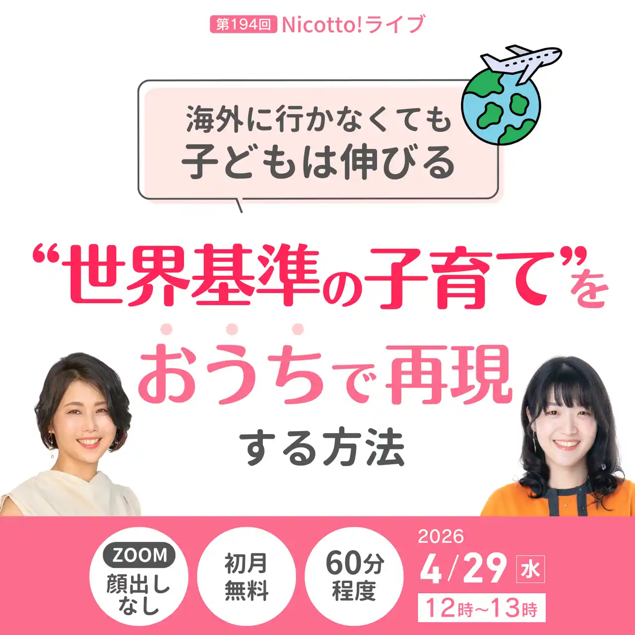 (株)パステルコミュニケーション(本社:東京都豊島区、代表取締役:吉野加容子)が運営する、発達障害・グレーゾーンの子どもを育てるママがいつでも学べて相談できるオンライン子育て塾「Nicotto!塾」は、2026年4月29日(水)お昼12時より、「海外に行かなくても子どもは伸びる 世界基準の子育てをおうちで再現する方法」をテーマにオンラインライブを開催いたします。 |
