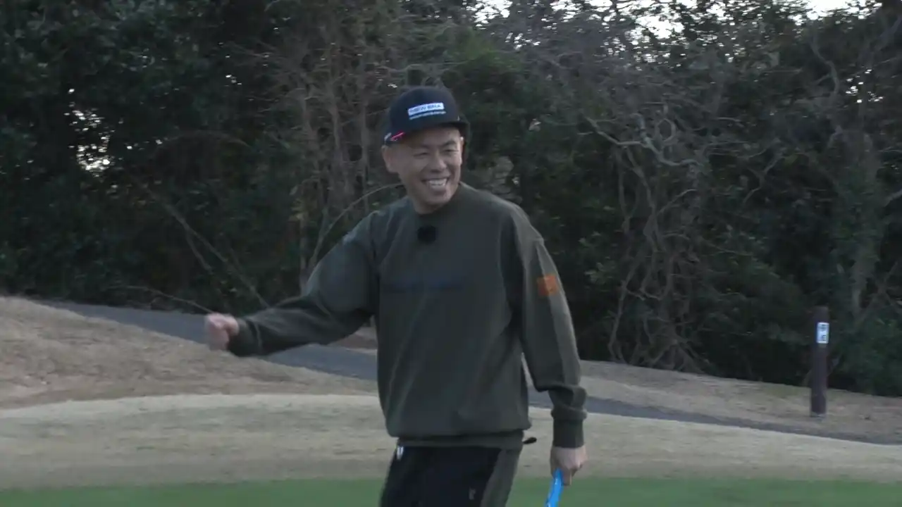 プレー中には、ティーチングプロA級の資格を持っている城後プロがレクチャーする一幕も。金ちゃんが悩みを打ち明けると「体重が右に残ると……」と的確なアドバイスを送ります。 |