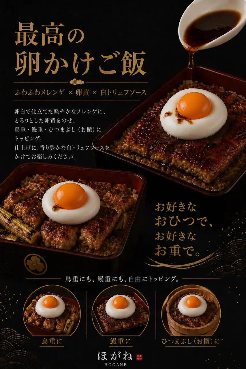 焼き鳥重は、香ばしく焼き上げた鶏と甘辛いたれをご飯と一緒に楽しめる一品。 さらに、卵白で軽やかに仕立てたメレンゲ、濃厚な卵黄、白トリュフソースを合わせた「ほがね流たまごかけご飯」もご用意しています。 |