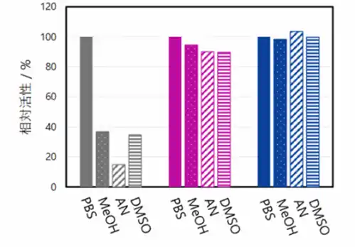 図3.アメーバハイドロゲルによって保護された酵素(β-ガラクトシダーゼ)の有機溶媒中における酵素活性(グラフ中央・赤、グラフ右・青)は、ハイドロゲルなし(黒)を顕著に改善。PBS:リン酸緩衝液、MeOH:メタノール、AN:アセトニトリル、DMSO:ジメチルスルホキシド。(グラフ中央・赤:酵素とハイドロゲルポリマーを直接共有結合、グラフ内右・青:酵素とハイドロゲルポリマーをスペーサー分子を介して共有結合) |