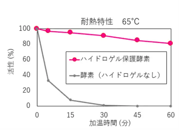 図2.アメーバハイドロゲルによって保護された酵素(β-ガラクトシダーゼ)の65℃における酵素活性(赤)は、ハイドロゲルなし(黒)の時の酵素活性の維持時間を顕著に改善 |