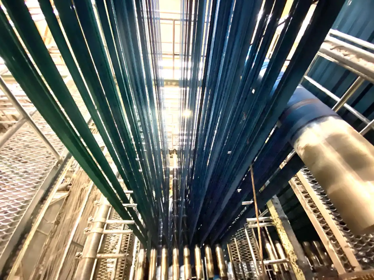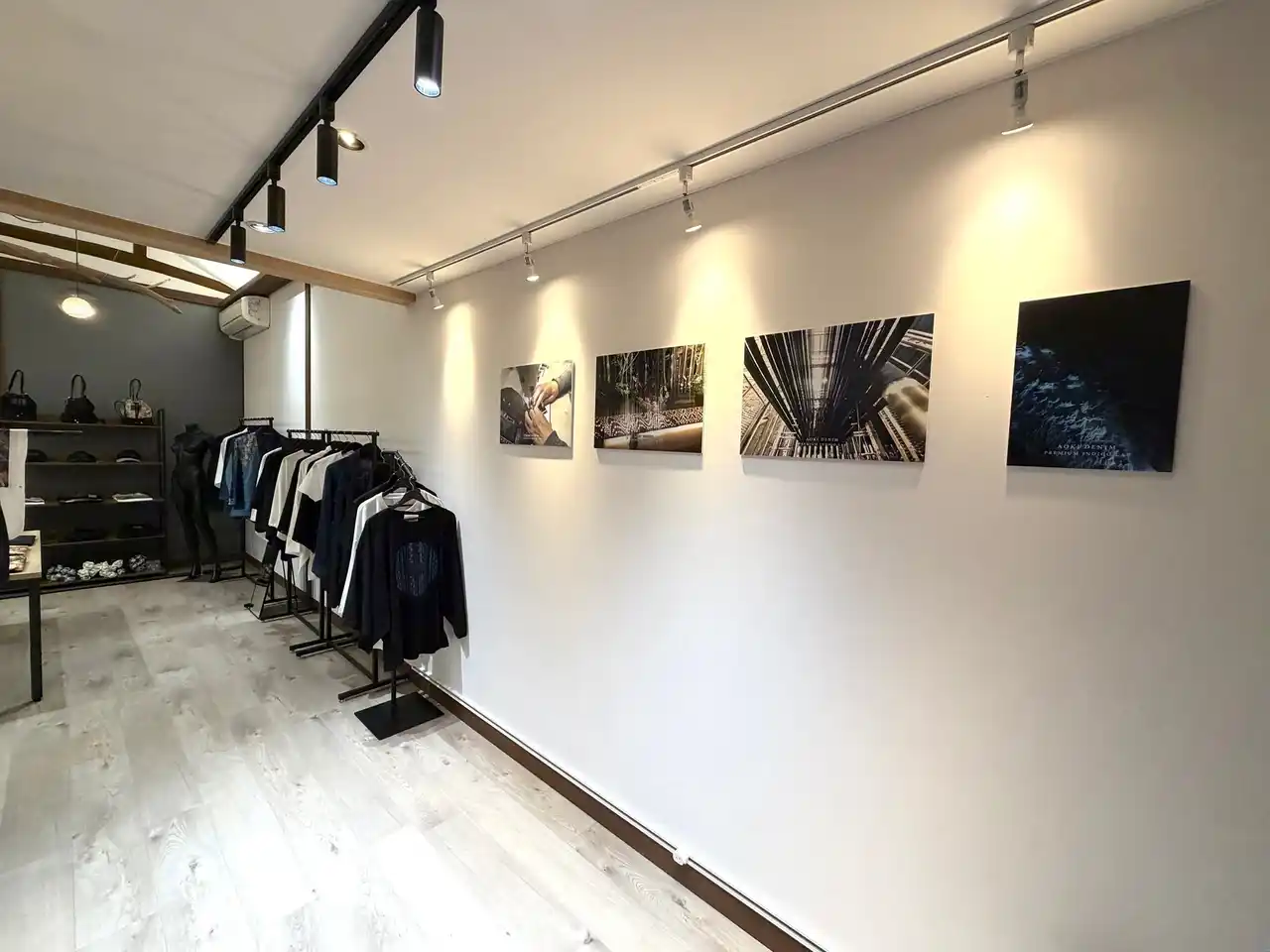 AOKI DENIM -PREMIUM INDIGO LAB- エントランス空間。シーズン別の制作現場やインスピレーションを映すパネル演出を行う |
