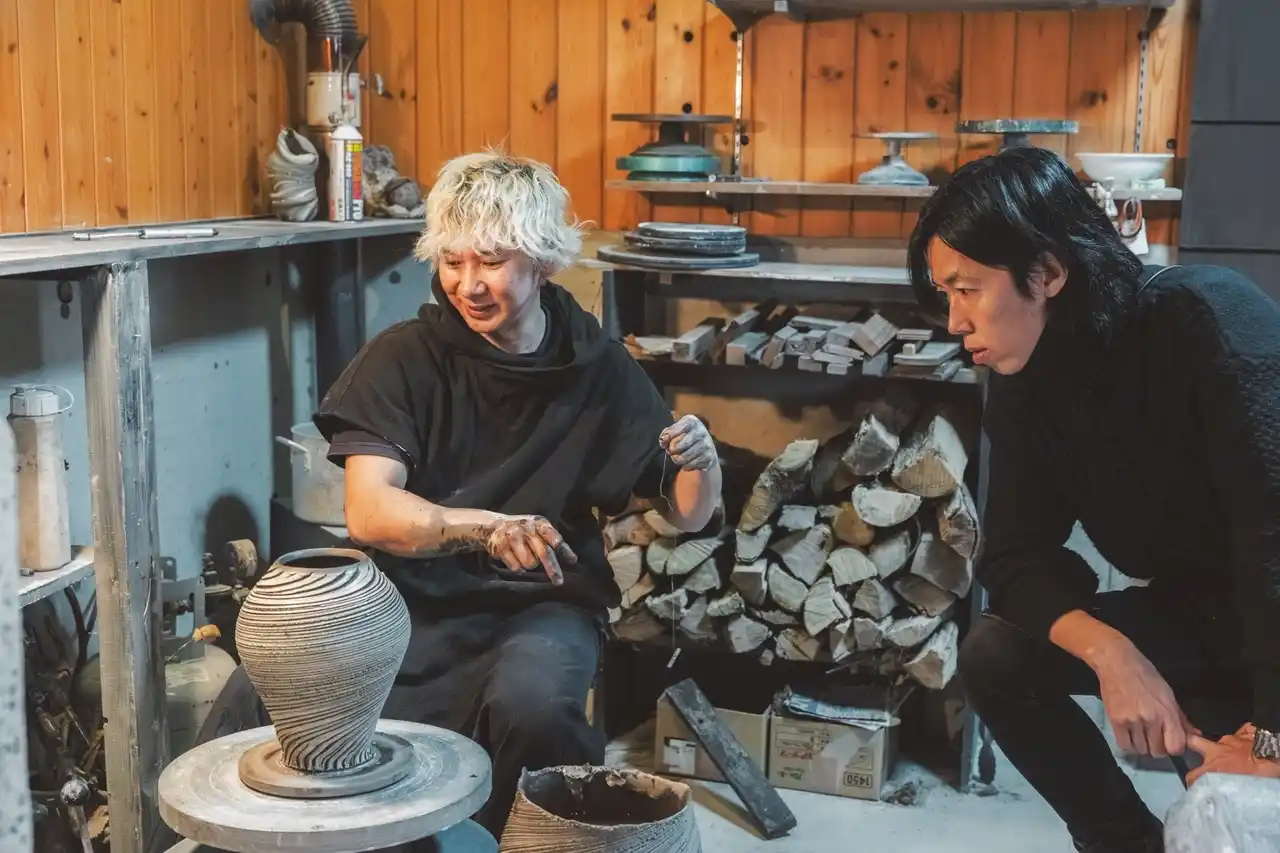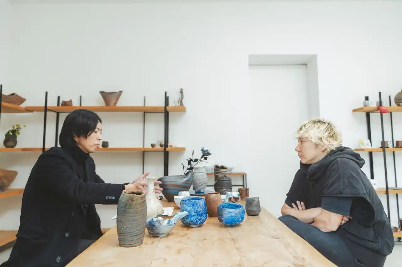コラボレーションの打ち合わせを重ねる AOKI DENIM デザイナー青木俊樹 (写真左) と備前焼作家 石田和也 氏 (写真右) |
