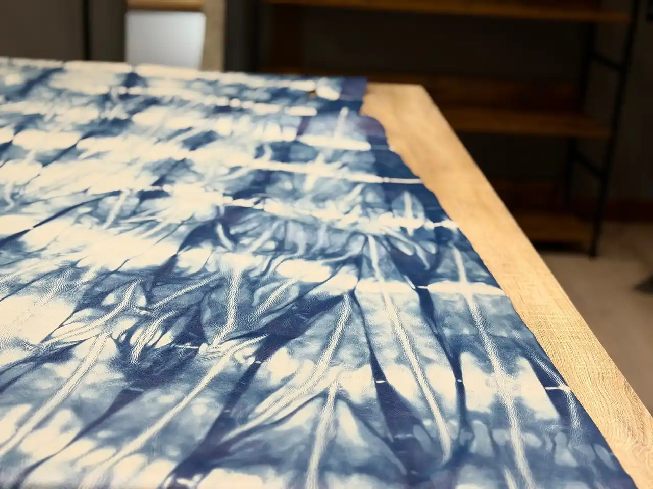 デニム製品に使用される本藍染を施した牛革。一枚一枚絞りの表情が違うのも魅力。店内でも公開されている。 |