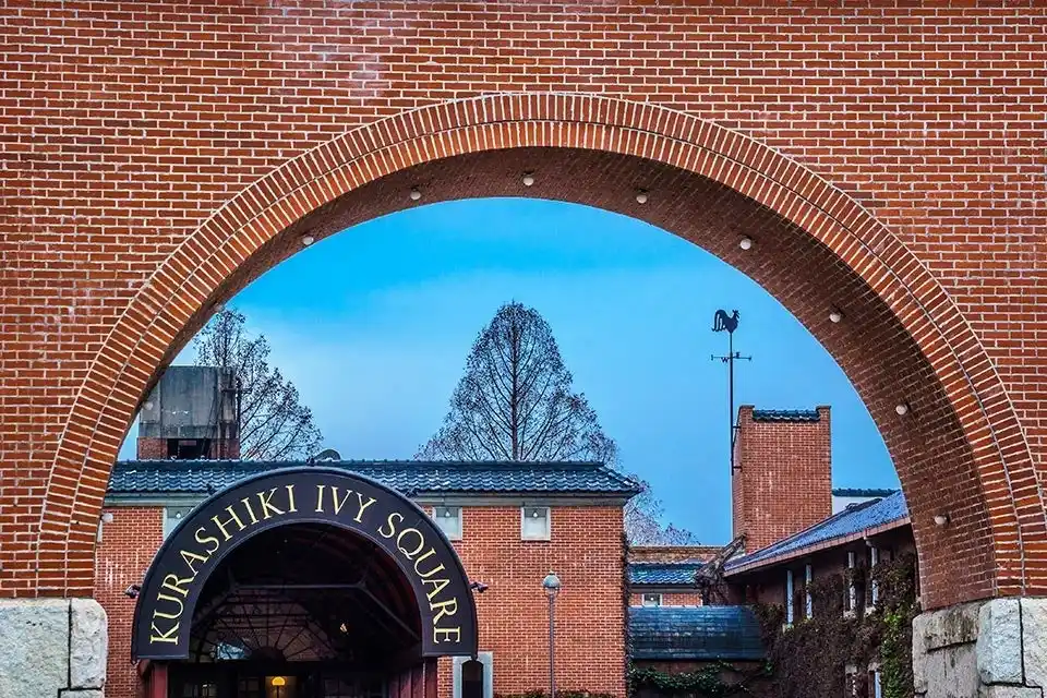 倉敷アイビースクエアはかつて倉敷が天領地であった時代に代官所があった所で、この場所に明治22年(1889年)、旧倉敷紡績所(現在のクラボウ)の本社工場が建設。戦後は倉庫として使用され、蔦の緑に包まれた美しい外観と基本構造を残しながら改装を加え、宿泊・飲食施設および文化施設も併設した複合文化施設として昭和49年(1974年)にオープン。 |
