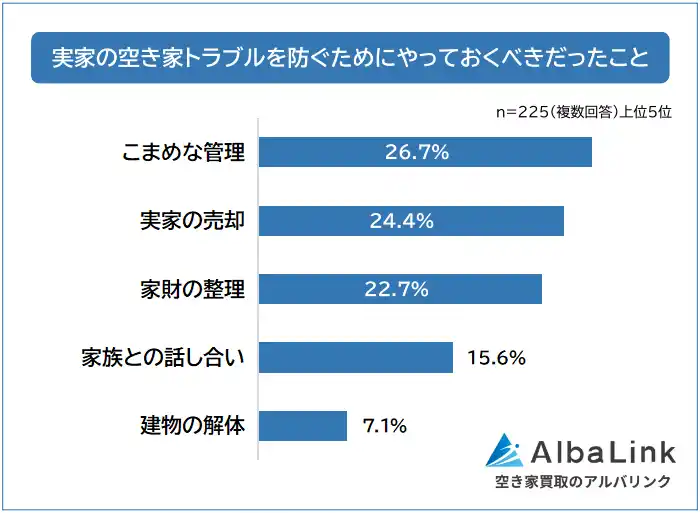 株式会社AlbaLink(本社:東京都江東区、代表取締役:河田 憲二)は、実家が空き家になった経験がある225人を対象に「実家の空き家でトラブルになったことに関するアンケート」を実施し、そのデータをランキングにしました。